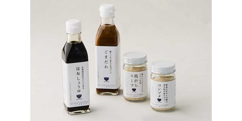 「ゆとりのキッチン 調味料」シリーズは、料理家 栗原はるみが、毎日の料理をもっとおいしく、もっと楽しめるように、そんな想いを込めて作った調味料です。昆布しょうゆ、ごまだれ、鶏がらスープ、コンソメの4種類の調味料をセットしました。