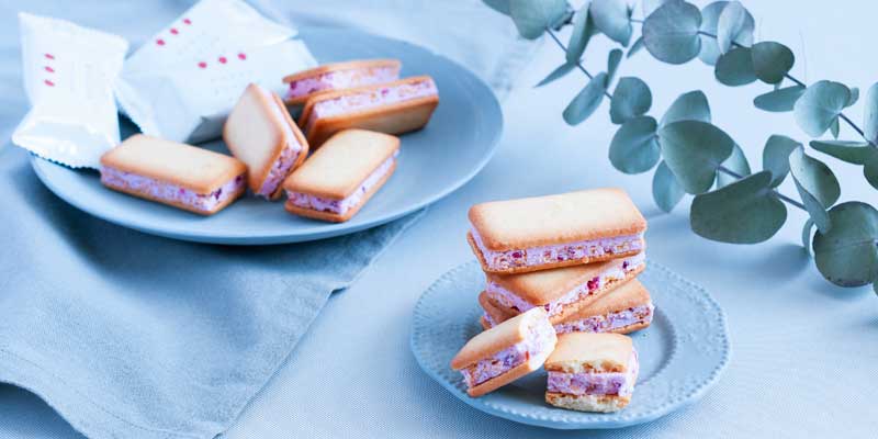 あまおう苺パウダーとラズベリーのフリーズドライが入ったホイップチョコを、芳醇なバターの香るクッキーでサンドしました。サクサクとした食感が魅力のあまおうバターサンド。